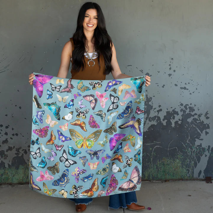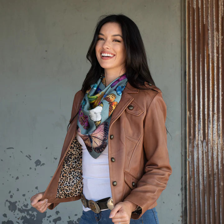 This fun multi-colored scarf with chambray background can really dress up a suit jacket or make a statement on denim.