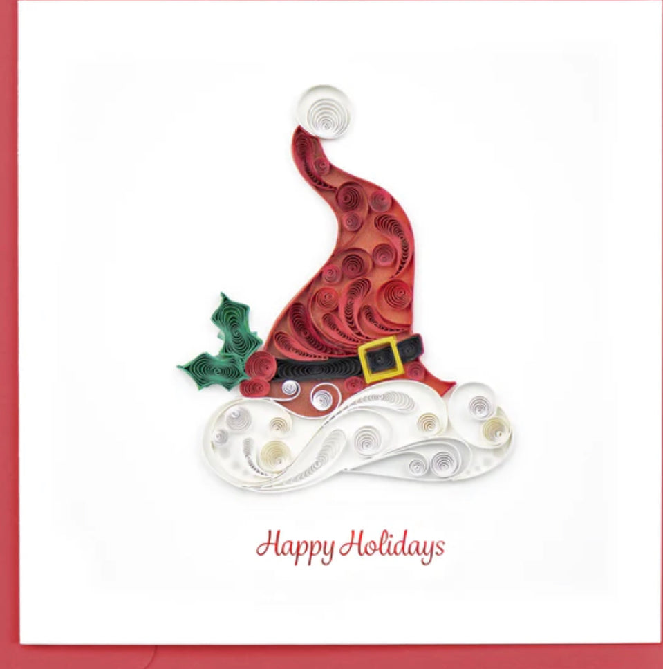 Send your loved ones wishes of peace and joy with the quilled Santa Hat card. A red quilled Santa hat with a white pompom and holly berries adorns the front of this card. Underneath the artwork are the words “Happy Holidays” written is script.