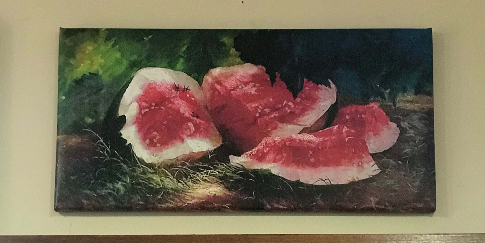 "Watermelon and Yellow Jackets" by Robert J Onderdonk from The Bryan Museum Collection. Canvas print, 16x30.